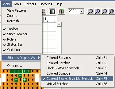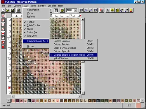 Stitches Display As (Отобразить стежки как) позволяет выбрать вариант отображения стежков на схеме (черно-белые символы, цветные кубики, цветные кубики с символами и т.п.).