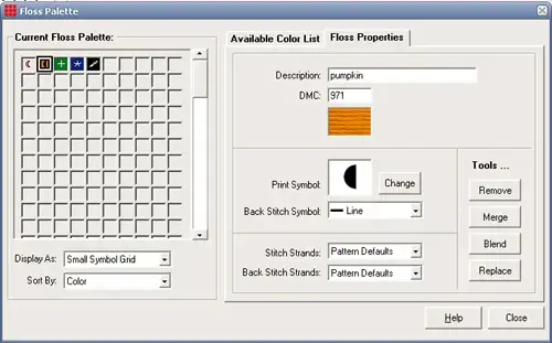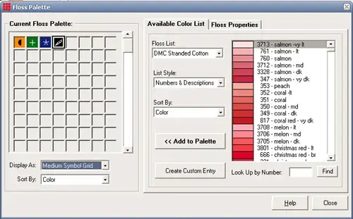 Слева расположена Current Floss Palette (Текущая палитра ниток), отображающая цвета ниток, которые будут использованы в набираемой схеме, а справа - две вкладки. Вкладка Available Color List (Список доступных цветов) содержит Floss List (Список ниток) полная палитра цветов ниток (DMC, DMC-вискоза, J&P Coats, Anchor и др.). Здесь же располагаются списки, в которых можно выбрать нужный цвет из палитры, а также способ отображения и сортировки цветов палитры. В правом нижнем углу расположена строка Look Up by Number (Поиск по номеру), в которую вводят номер нужного цвета ниток и нажимают кнопку Find (Найти). Так осуществляется быстрый поиск цвета ниток по номеру.