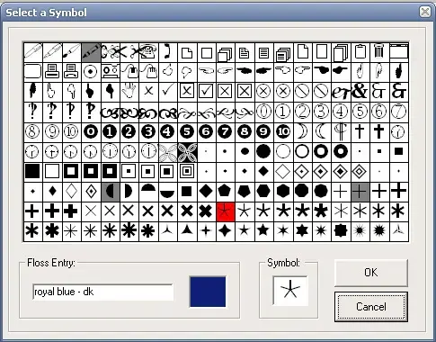 Для добавления цветов в текущую палитру ниток выберите в Палитре цветов необходимый цвет нажмите кнопку Add To Pallete, появляется диалоговое окно Select a Symbol (Выбор символа), в котором выберите условное обозначение данного цвета по возможности сходное с символом имеющейся схемы и нажмите кнопку ОК. Повторяя эти операции, заполните текущую палитру необходимыми цветами. Когда все цвета будут добавлены, нажмите кнопку Close (Закрыть). Затем сохраните файл будущей схемы, присвоив ей имя.