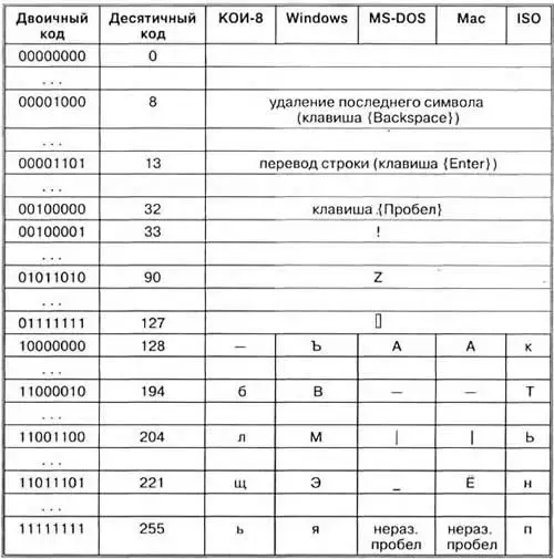 Для обработки текстовой информации на компьютере необходимо представить ее в двоичной знаковой системе (в виде 0 и 1). Для кодирования каждого знака требуется количество информации, равное 8 битам, т. е. длина двоичного кода знака составляет восемь двоичных знаков. Каждому знаку необходимо поставить в соответствие уникальный двоичный код из интервала от 00000000 до 11111111 (в десятичном коде от 0 до 255)