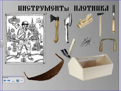 (Работа на ИД. Вызывается к доске желающий ученик, он передвигает в специальное место нужные плотнику инструменты и называет их, если знает).