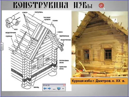 Основой любой деревянной постройки - жилища, церкви, амбара, бани и прочих - являлся сруб. Стены сруба делали из горизонтально сложенных бревен - венцов, которые складывали друг на друга, по краям вырубив округлые углубления. В них - то и клали следующее бревно. Между бревнами для тепла прокладывали мох. Так постепенно возводились стены сруба (клети) - коробки будущей избы. Крышу делали покатой с двух сторон. Покрывали ее тоненькими дощечками из осины, которые скрепляли одну с другой. Это у богатых крестьян. Бедняки же крыли свои дома соломой. Солому на крышу складывали рядами снизу. Каждый ряд привязывали к основе кровли лыком. После покрытия солому «счесывали» граблями и поливали жидкой глиной для прочности. Во время дождя вода стекала с крыши в специально выдолбленные желоба, которые удерживались под крышей крюками, называемые «курицами». Верх кровли прижимали тяжелым бревном - охлупнем, конец которого имел форму конской головы. Отсюда и пошло название - конек. Конь для русского крестьянина был древним символом солнца. Поэтому конь на крыше стал солнечным знаком, защищающем дом и людей, живущих в нем. Фундамента под домом не было, зато русская изба имела подклет - высокое подполье. В нем держали скот, птицу, хранили съестные припасы. Оконные проемы делали небольшими. Как вы думаете почему? Для сохранения тепла. Совсем маленькие оконца с задвижкой в виде доски назывались «волоковые». Большие окна носили название «красных». Просветы в окнах затягивали бычьим пузырем, промасленным полотном или слюдой.