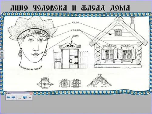 (Во время объяснения экскурсовод на ИД сравнивает фасад избы с лицом человека)