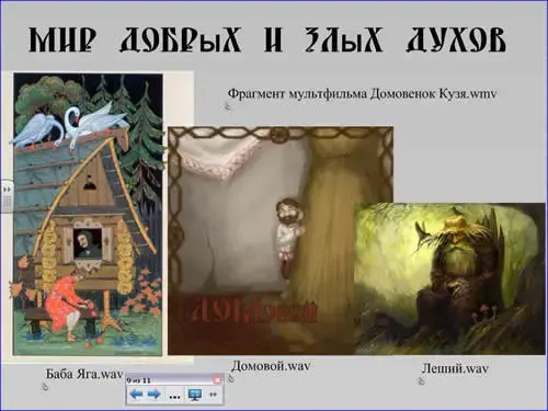 Домовой: Здравствуйте ребята! Я Домовой, счастье в дом приношу. Я стаж не только дома, но и главным образом всех живущих в нем. Живу я под печкой или за ней. Я добрый дух, но люблю и поозорничать. То одеяло со спящих людей стяну, то муку рассыплю. А бывает, и помогу: дров наколю, укачаю ребенка. В доме я вижу все неполадки и подсказываю хозяину и хозяйке, где и что нужно сделать. Мне подчиняются все остальные духи усадьбы: дворовой, банник, овинник и кикимора. (Показывает на соответствующие картинки).