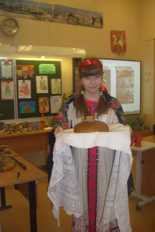 Встречают учащихся начальной школы девочки - экскурсоводы, одетые в русские народные костюмы. При входе, всем ребятам раздаются жетоны разных цветов (желтый, красный, зеленый, синий).