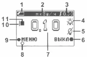 4. Кнопка «ВЫКЛ» и ее пиктограмма на дисплее. Кнопка имеет четыре функции: включение изделия, включение подсветки ЖК-дисплея, возврат в меню, выключение изделия.