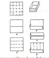 Когда ребёнок овладеет навыком чёткого складывания бумаги пополам, можно предложить ему сделать объёмную форму поделки: коробку для пуговиц бабушке или маме, корзиночку, которую он повесит на ёлку, гараж для маленькой машины и т. п. Всё это делается путём складывания квадратного листа бумаги на 16 маленьких квадратиков и надрезания сторон в разных местах.