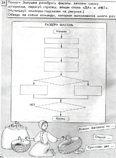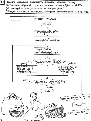 Ребята рассмотрите рисунок. В виде чего представлен наш алгоритм? (В виде блок-схемы.) Что такое блок-схема? (Это алгоритм, в котором команды записываются в геометрические фигуры, соединенные стрелочками.) Что обозначает стрелочка? (Какую команду выполнять следующей.) Что записывают в ромб? (Условие, вопрос.) Что записывают в прямоугольник? (Команды, действия.) Прочитайте данные в задании команды-подсказки. Что пропущено в командах-подсказках? (Откуда Золушка будет брать фасолину, что ей потребуется открыть и каких два предмета ей нужно приготовить - мешок и две корзины: круглую и овальную.)