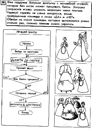 Ребята рассмотрите внимательно рисунки и блок-схему к заданию. Скажите, каких команд здесь не хватает? Допишите их. (Долети до платья, вернись в шкатулку.) Прочитайте вопрос в первом ромбике. Если все банты на платье пришиты, куда будем двигаться? (Вниз.) Иначе? (Идем на команду "Пришей бант".) Прочитайте вопрос во втором ромбике. Если платья остались, куда двигаемся? (Возвращаемся на команду "Долети до платья".) Иначе? (Двигаемся вниз.) какие алгоритмические структуры вам даны в этом задании? (Два цикла, один вложен в другой.) А теперь возьмите любой цветной карандаш и обведите те команды, которые выполняются ровно столько раз, сколько платьев нужно украсить. (Долети до платья, остались платья.)