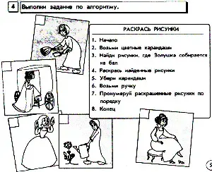 Нам необходимо по готовому алгоритму выполнить задание. Для этого понадобятся цветные карандаши. Назовите действие, тот или иной выполняет Золушка на каждом рисунке. (Ответы детей.) Какие рисунки нужно было раскрасить? (Золушка смотрится в зеркало, надевает туфельку, садится в карету.) В каком порядке раскрашенные рисунки нужно пронумеровать и почему? (1- смотрится в зеркало, 2 - надевает туфельку, 3 - садится в карету.)