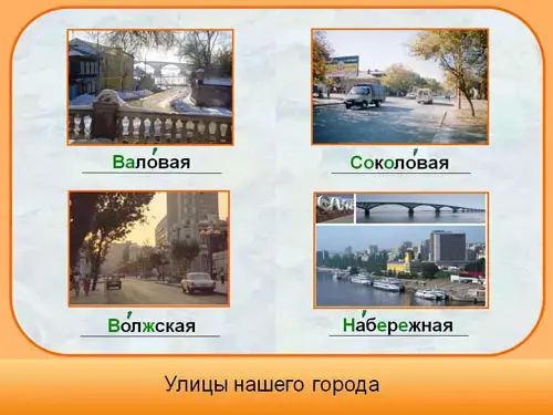 Учитель называет улицы: Валовая, Соколовая, Волжская, Набережная. Ученики записывают их названия с орфограммами на интерактивной доске и в тетрадях.