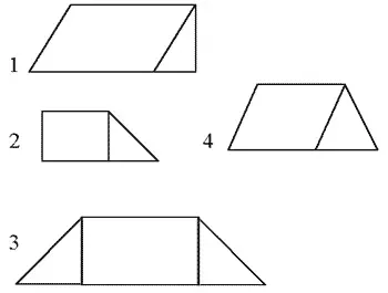 | Раздает ученикам разрезные фигуры и предлагает сложить из них трапеции. | Работают в парах, складывают фигуры. |
