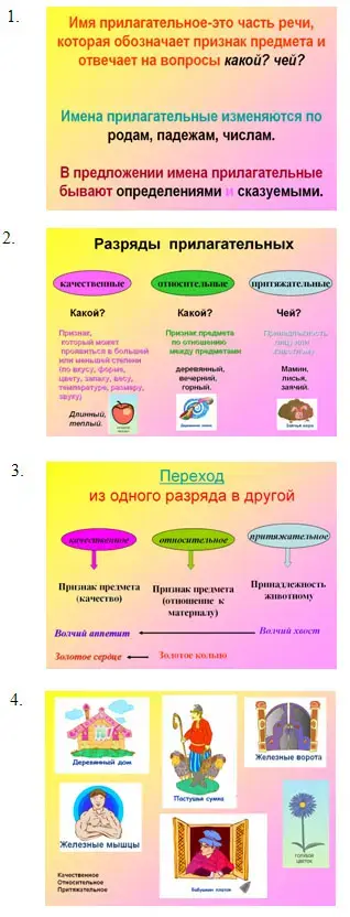 - образовательные: познакомить с разрядами прилагательных, признаками каждого разряда; научить определять разряд имени прилагательного по нескольким классификационным признакам,
