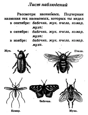 - Рассмотри насекомых. Подчеркни названия тех насекомых, которых ты видел в октябре: пчела, муха.