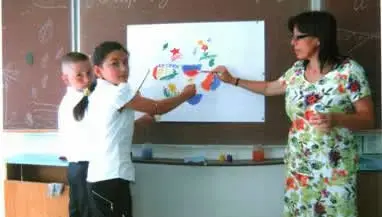 Давайте мы сегодня внесем свой вклад в дело борьбы за мир. Все вместе мы создадим плакат о мире «Я ГОЛОСУЮ ЗА МИР!!!» ( на доске прикреплен ватман с рисунком (символом мира класса ) На этом же листе каждый из детей обводят свои ладони и подписывают за что они голосуют.