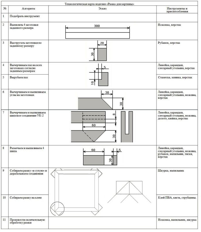 Оборудование и инструменты: тематические распечатки, столярный верстак, ножовка, стамеска, киянка, угольник, линейка, карандаш, транспортир, образец рамки для картины, чертеж изделия.