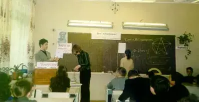 Далее учитель представляет следующую группу участников конференции "Практиков", они готовят к выступлению всё необходимое, и все учащиеся уходят на небольшой 10-минутный перерыв. В кассете табличка заменяется надписью "Практики"