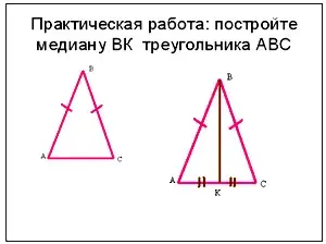 От теоретических вопросов о том, что такое медиана, высота и биссектриса треугольника, учащимся предлагается выполнить практическую работу по построению этих новых для учащихся элементов. Задания практического характера сформулированы на слайдах. Применение интерактивной доски позволяет учащимся на готовых чертежах треугольника строить основные его элементы. Ниже показаны слайды к практической работе.