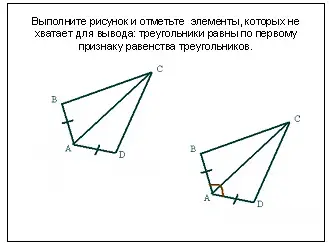 Четвертый этап урока ( 10 мин) - этап решения нестандартных задач (на первый признак равенства треугольников). Эти задачи позволяют глубже понять первый признак равенства треугольников и подготовить учащихся к доказательству новых теорем. Задачи формулируются с помощью слайда (см. ниже).