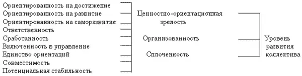 Мы считаем, что гармонизация отношений всех уровней и дает ту общность, совместимость, общее согласие, взаимное соответствие и стройную полноту, которую Владимир Иванович Даль и определил как ансамбль. Вопрос о педагогическом ансамбле школы мы связываем с проблемой уровня развития коллектива. Согласно современным научно-педагогическим представлениям (В.С.Лазарев, М.М.Поташник, И.А.Афанасьева и др.) под этим понимают характеристику способности коллектива ставить актуальные и реалистические общие цели, строить и гибко изменять систему взаимодействий и взаимоотношений, обеспечивающих достижение поставленных целей с максимально возможной эффективностью. Схематично структуру характеристик развития педколлектива эти исследователи представили следующим образом: