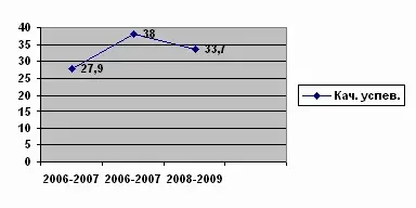 Из диаграммы видно, что качественная успеваемость в 2008-2009 учебном году повысилась в сравнении с 2006-2007 учебным годом на 5,8% и снизилась на 4,3% в сравнении с предыдущим годом. Причина снижения - выбытие из школы учеников, обучающихся на "4" и "5".