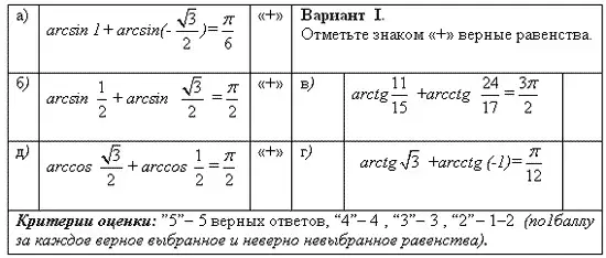 Этап III. Проводим входной контроль знаний и умений в форме теста, чтобы определить уровень готовности учащихся к дальнейшей работе Задания теста проверяют умения учащихся применять свойства обратных тригонометрических функций. При необходимости проводиться коррекция знаний путем дополнительного объяснения.