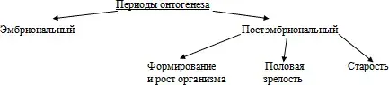 - эмбриональный период - от момента слияния гамет до рождения, продолжительность периода различна, идет развитие зародыша;