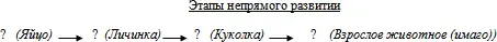 Просмотреть анимационную схему «Развитие насекомых с полным превращением» (диск 1С: Школа. Основы общей биологии 9 класс) и составить аналитическую схему «Этапы непрямого развития» (схема на слайде презентации).