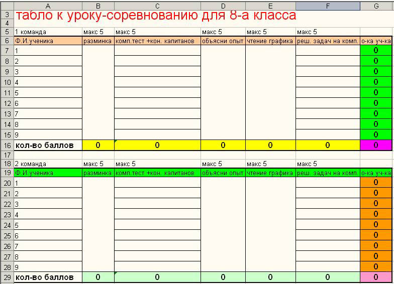 Очень часто при проведении нестандартных уроков на повторение темы ( урок - соревнование, урок - турнир, урок - эстафета и т.д.), необходимо быстро оценивать не только команду ( группу, соревнующих учащихся ), но и индивидуальную работу каждого члена группы, а затем подводить итоги, представляя результаты деятельности на обозрение учащихся. Такую работу можно поручить компьютеру, создав электронное табло с помощью Microsoft Excel.