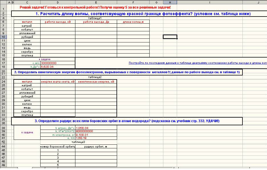 Приведу пример такого рода работы, составленной мною по теме "Квантовая теория электромагнитного излучения". На <Рисунке2> можно рассмотреть несколько примеров задач по этой теме: нахождение длины волны, соответствующей красной границе фотоэффекта, определение кинетической энергии фотоэлектронов, вырываемых с поверхности металлов, определение радиуса пяти боровских орбит в атоме водорода. При выполнении данной работы учащиеся целиком поглощены в физический процесс. Их задача сводится к тому, чтобы найти необходимые данные в таблице постоянных величин по работе выхода и занести необходимые формулы в ячейки " работа выхода, Дж", " длина волны, м" и т.д., а математические расчёты, причём, с очень большой точностью, выполнит компьютер, если, конечно, с физической точки зрения, все операции выполнены учеником правильно. Если на обычном уроке ученики решат максимум 4-5 задач, то на уроке с использованием электронных таблиц до 15-20. Самое главное, что после решения ученик сможет производить оценивание результата расчётов, например, соотношение работы выхода и длины волны электромагнитного излучения.