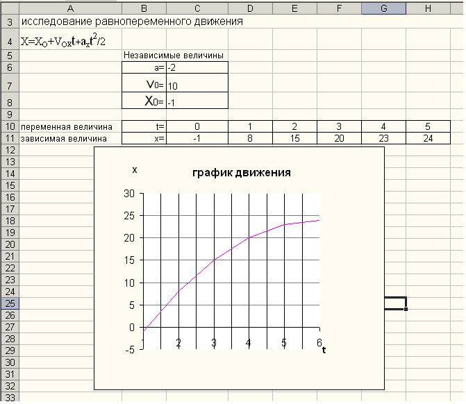 Графическими называют задачи, в которых объектом исследования являются графики зависимости физических величин. В одних задачах эти графики заданы в условии, в других - их надо построить. Если график зависимости между величинами дан, да ещё электронным способом легко может быть изменён, при изменении значения исходных данных, насколько эффективнее пойдёт исследование, например, равнопеременного движения, можно себе представить. На <Рисунке3> представлена работа, выполненная в Microsoft Excel по исследованию равнопеременного движения. Учащимся я предлагаю изменить значения исходных данных: ускорения, начальной скорости и начальной координаты. Автоматически будет видоизменяться и график движения. Поэтому наглядно видно как соотносятся уравнение движения и графическое представление зависимости координаты движущегося тела от времени. По этому же проекту может быть предложена такая задача учащимся, построить график для вполне конкретного уравнения движения и охарактеризовать его. Вариантов работы с готовым проектом на уроке может быть различное множество. Такие работы можно составлять и для исследования гармонических колебаний.