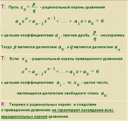 Повторяются методы решения целых алгебраических уравнений. Одновременно на экран проецируются фрагменты теории из электронного учебника.