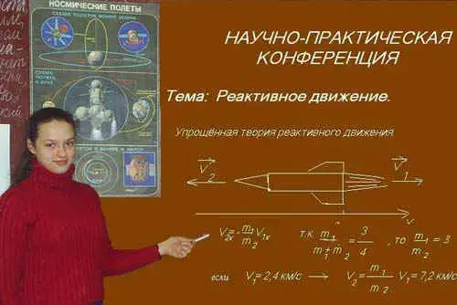 Учитель: Спасибо всем, кто принял участие в подготовке сегодняшней конференции. Я думаю, вы внимательно слушали и анализировали, представленную информацию о реактивном движении и сумеете распознать его среди других видов движения, понимаете, что именно закон сохранения импульса позволяет теоретически рассчитывать и оценивать скорость - ракеты, которая зависит от отношения массы тела к массе оболочки.