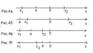 При а < 0 нас устраивает взаимное расположение интервала (х1;х2) и точки а на числовой оси, изображенное на рис. 4а,б,в, не устраивает - на рис. 4г.
