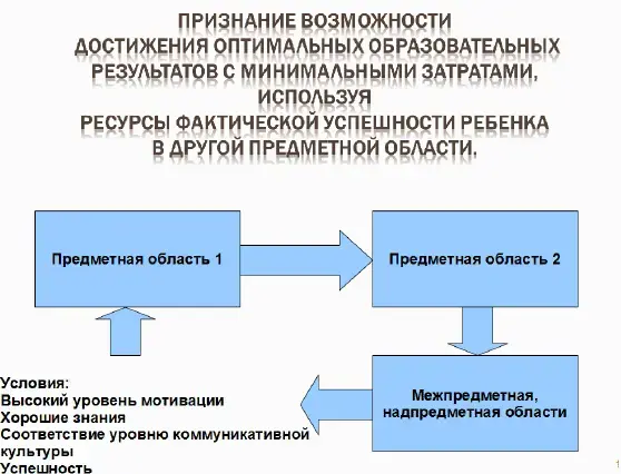 Поэтому надо признать возможность достижения оптимальных образовательных результатов с минимальными затратами, используя ресурсы фактической успешности ребенка в другой области знаний.