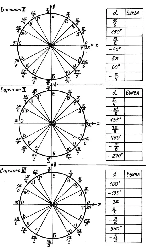 На парту каждому ученику раздаётся карточка с заданием , которое объясняет учитель: " В таблицу рядом с окружностью вы должны поставить ту букву, в которую перейдет конец единичного радиуса ( точка Т) при повороте его на заданный угол а ".