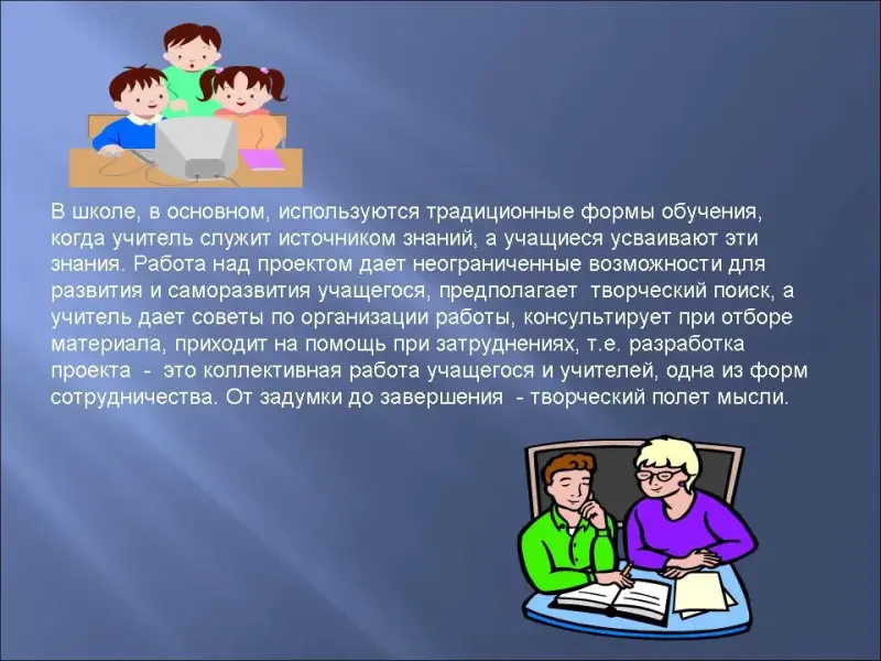 В школе, в основном, используются традиционные формы обучения, когда учитель служит источником знаний, а учащиеся усваивают эти знания. Работа над проектом дает неограниченные возможности для развития и саморазвития учащегося, предполагает творческий поиск, а учитель дает советы по организации работы, консультирует при отборе материала, приходит на помощь при затруднениях, т.е. разработка проекта - это коллективная работа учащегося и учителей, одна из форм сотрудничества. От задумки до завершения - творческий полет мысли. Творческие способности присущи любому ребенку, только их нужно вовремя раскрыть и развить.