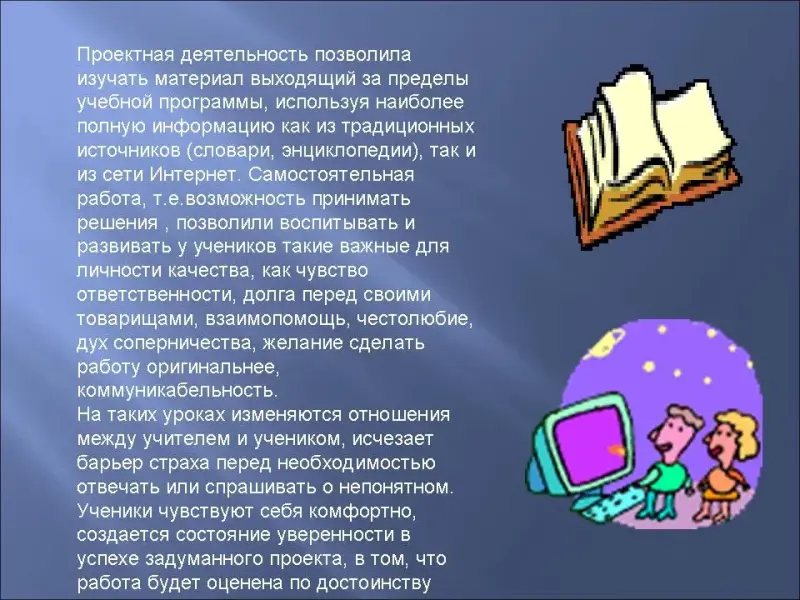 На таких уроках изменяются отношения между учителем и учеником, исчезает барьер страха перед необходимостью отвечать или спрашивать о непонятном. Ученики чувствуют себя комфортно, создается состояние уверенности в успехе задуманного проекта, в том, что работа будет оценена по достоинству