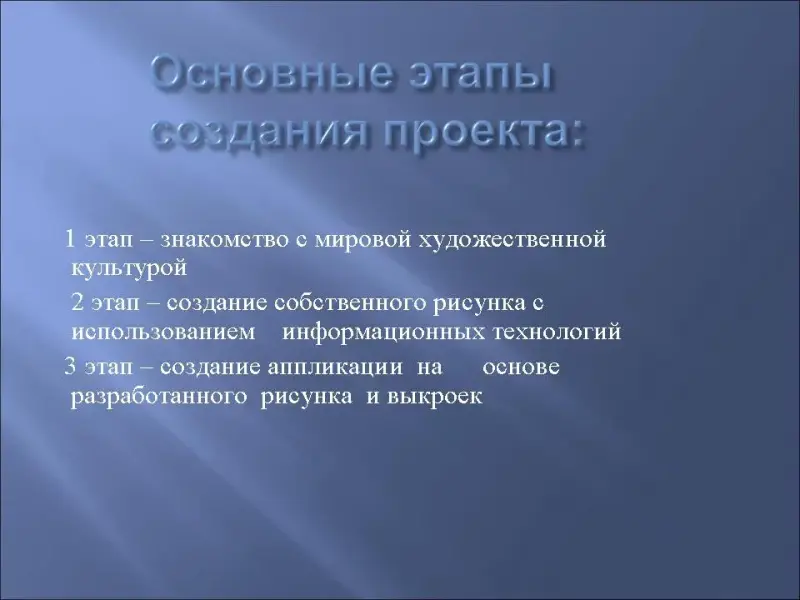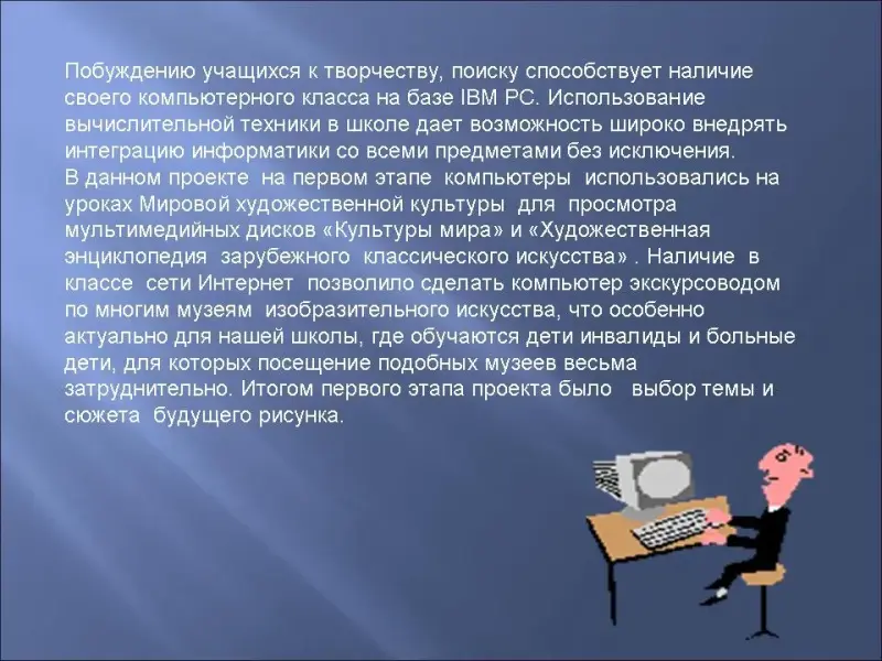 В данном проекте на первом этапе компьютеры использовались на уроках Мировой художественной культуры для просмотра мультимедийных дисков «Культуры мира» и «Художественная энциклопедия зарубежного классического искусства». Наличие в классе сети Интернет позволило сделать компьютер экскурсоводом по многим музеям изобразительного искусства, что особенно актуально для нашей школы, где обучаются дети инвалиды и больные дети, для которых посещение подобных музеев весьма затруднительно. Итогом первого этапа проекта было выбор темы и сюжета будущего рисунка.