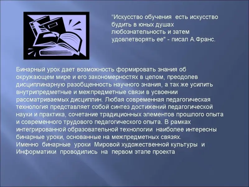 Именно бинарные уроки Мировой художественной культуры и Информатики проводились на первом этапе проекта