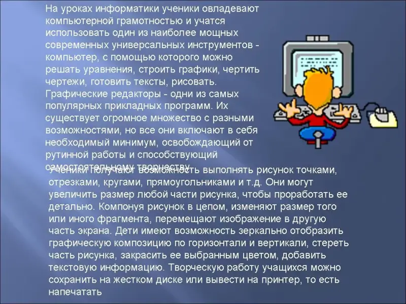 На уроках информатики ученики овладевают компьютерной грамотностью и учатся использовать один из наиболее мощных современных универсальных инструментов - компьютер, с помощью которого можно решать уравнения, строить графики, чертить чертежи, готовить тексты, рисовать. Графические редакторы - одни из самых популярных прикладных программ. Их существует огромное множество с разными возможностями, но все они включают в себя необходимый минимум, освобождающий от рутинной работы и способствующий самостоятельному творчеству.