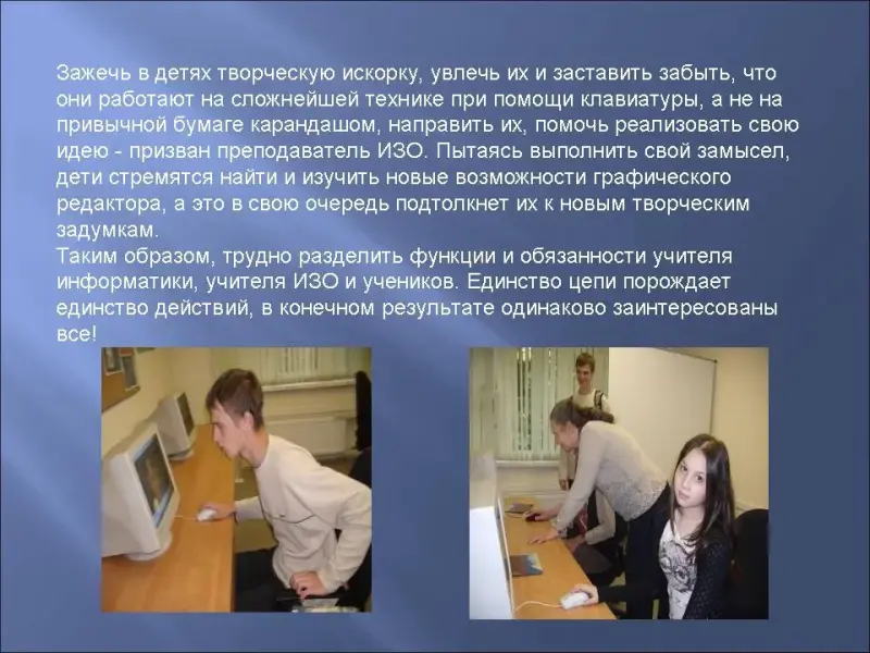 Таким образом, трудно разделить функции и обязанности учителя информатики, учителя ИЗО и учеников. Единство цепи порождает единство действий, в конечном результате одинаково заинтересованы все!