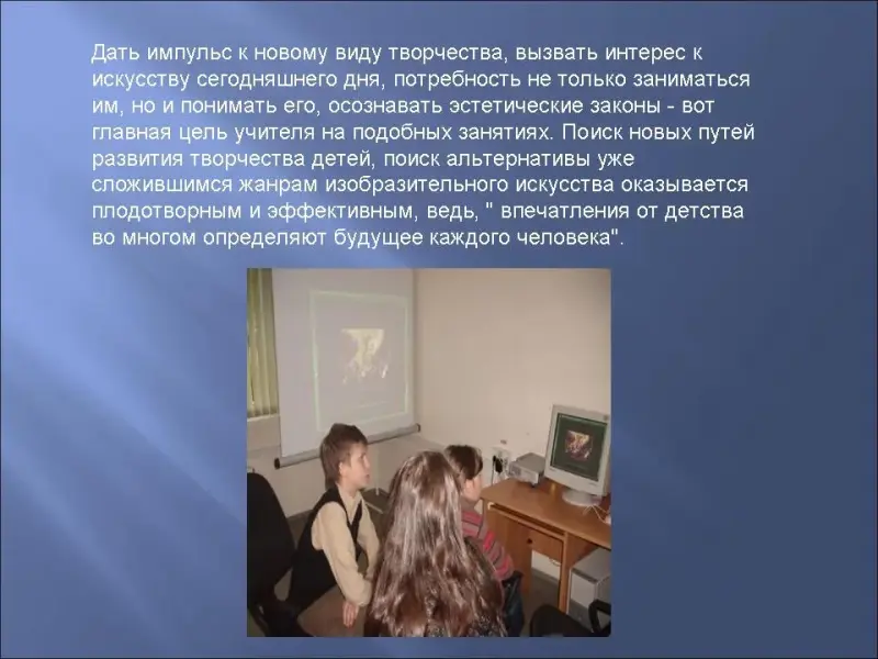 Дать импульс к новому виду творчества, вызвать интерес к искусству сегодняшнего дня, потребность не только заниматься им, но и понимать его, осознавать эстетические законы - вот главная цель учителя на подобных занятиях. Поиск новых путей развития творчества детей, поиск альтернативы уже сложившимся жанрам изобразительного искусства оказывается плодотворным и эффективным, ведь, "впечатления от детства во многом определяют будущее каждого человека".