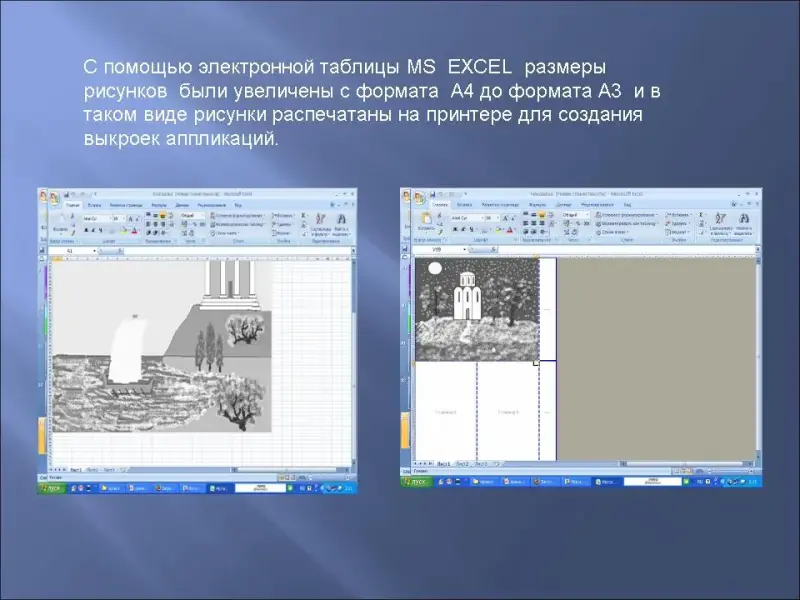 С помощью электронной таблицы MS EXCEL размеры рисунков увеличены с формата А4 до формата А3 и в таком виде рисунки распечатаны на принтере для создания выкроек аппликаций.
