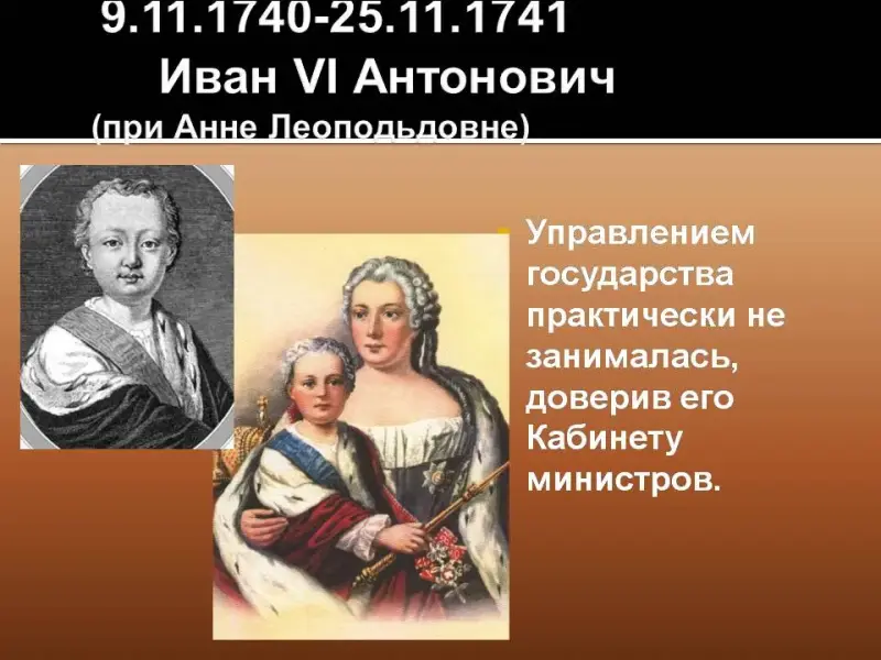Иван Антонович, сын Анны Леопольдовны, (дочери герцога Мекленбург-Шверинского - Карла Леопольда и Екатерины Ивановны (с 1722, живущей в России) и принца Антона-Ульриха Брауншвейга-Беверн-Люненбургского. Бирон отстраняет от власти родителей, но 8 ноября 1740 года Бирон арестован, Миниху для этого понадобилось всего 80 гвардейцев и в результате регентшей при маленьком Иване Антоновиче стала его мать - Анна Леопольдовна. Арестованы и отправлены в крепость Раненбург