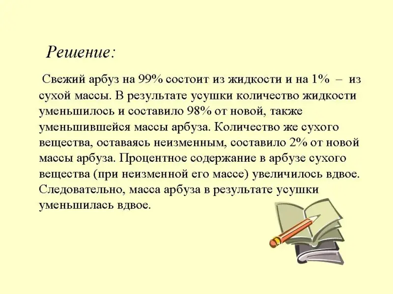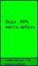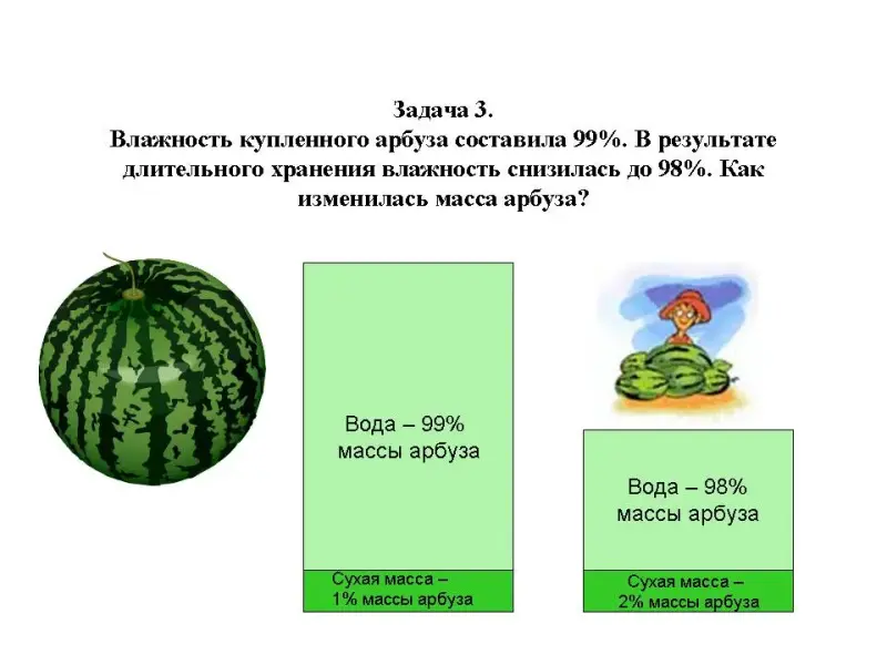 Задача 4. Влажность купленного арбуза составила 99%. В результате длительного хранения влажность снизилась до 98%. Как изменилась масса арбуза?