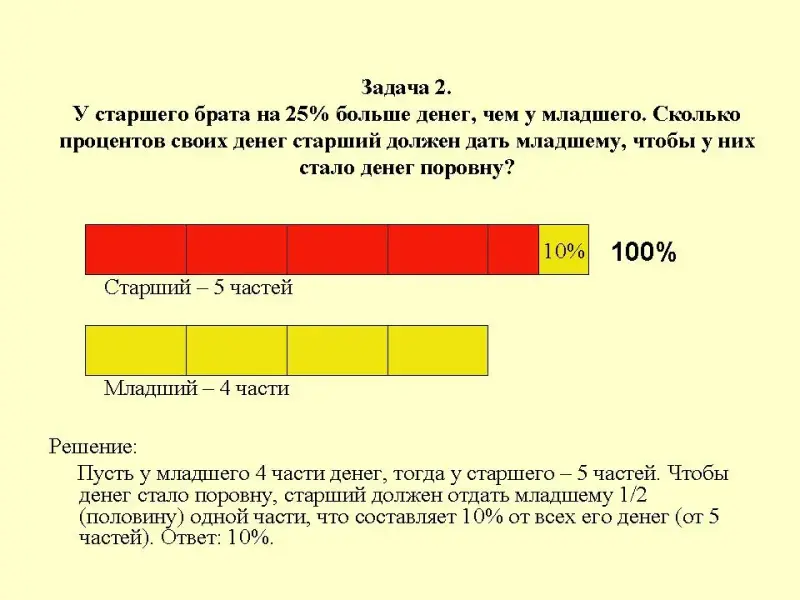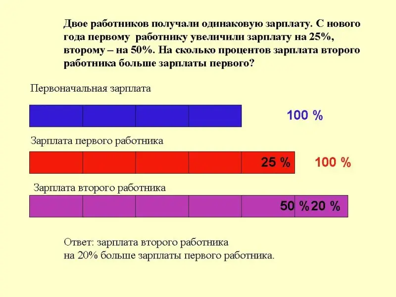 Задача 1. Двое работников получали одинаковую зарплату. С нового года первому работнику увеличили зарплату на 25%, второму - на 50%. На сколько процентов зарплата второго работника больше зарплаты первого?
