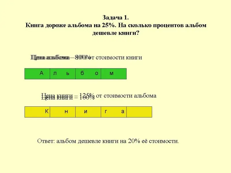 Задача 2. Книга дороже альбома на 25%. На сколько процентов альбом дешевле книги?