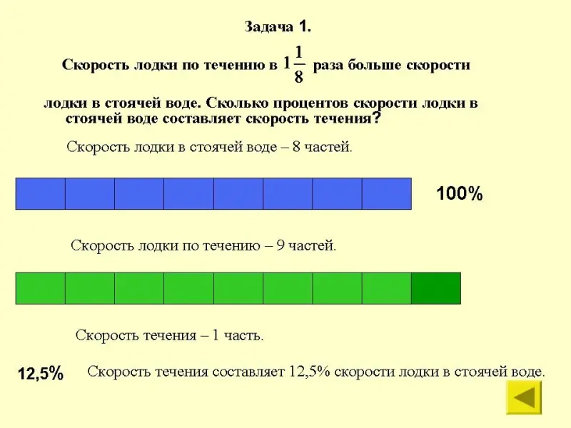 - Скорость лодки по течению в … раза больше скорости лодки в стоячей воде. Сколько процентов скорости лодки в стоячей воде составляет скорость течения?