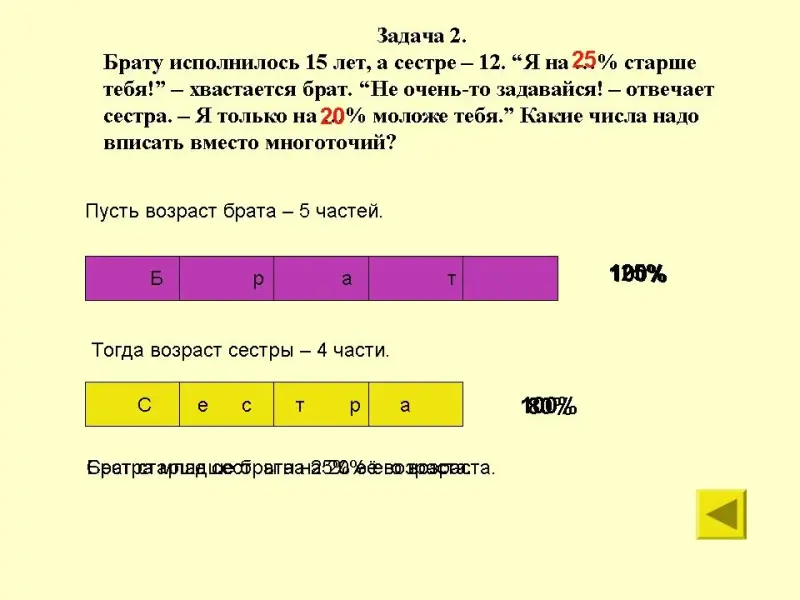 - Брату исполнилось 15 лет, а сестре - 12. "Я на …% старше тебя!" - хвастается брат. "Не очень-то задавайся! - отвечает сестра. - Я только на …% моложе тебя." Какие числа надо вписать вместо многоточий?